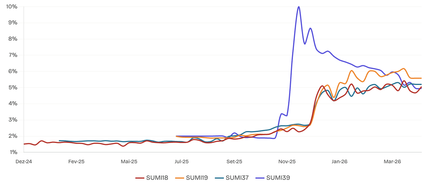 Spread Over NTN-B (% a.a.) · SUMI18, SUMI19, SUMI37, SUMI39 · Fonte: ANBIMA · Ref: 2026-04-24