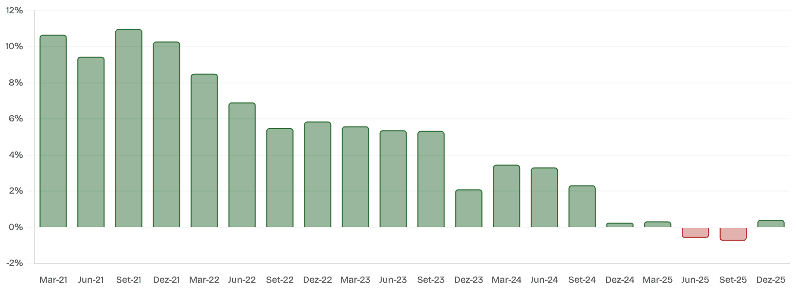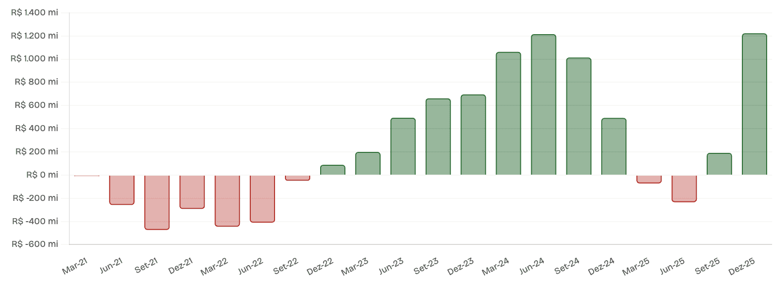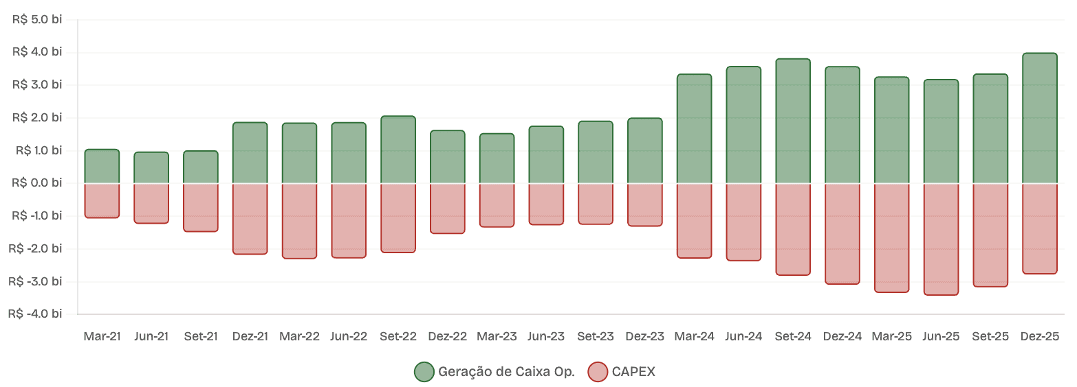 No 4T25, porém, o EBITDA foi recorde trimestral em R$ 202,8 milhões com margem de 49,2%, geração de caixa positiva de R$ 61 milhões no 2S25, e a alavancagem ficou em 3,58x, dentro do covenant flexibilizado de 3,85x. A perspectiva negativa da S&P indica chance de um terço de novo downgrade nos próximos seis a doze meses.