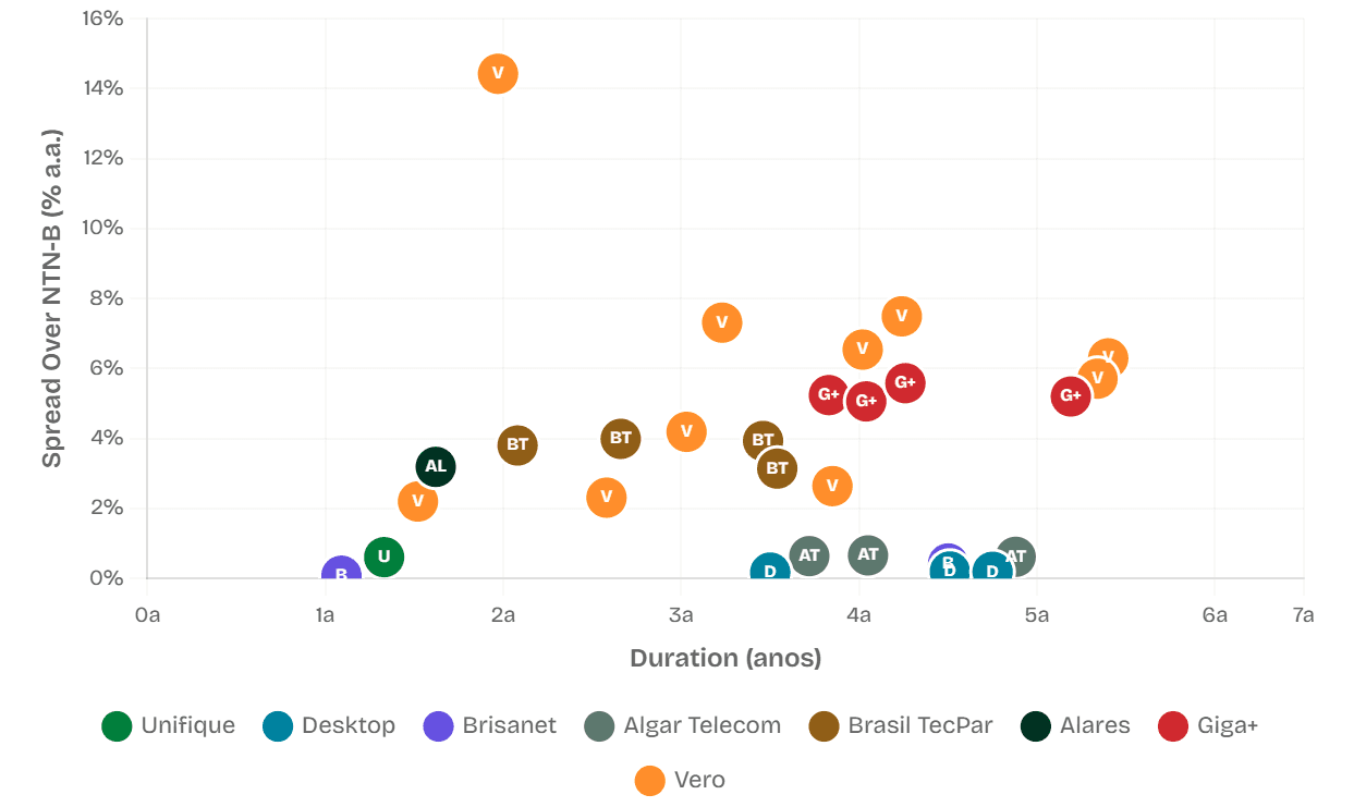 Conclusão: A tese setorial dos ISPs regionais brasileiros continua válida, mas exige seleção rigorosa. Para os papéis saudáveis — Unifique (brAA), Brisanet (brAA-), Desktop (brA+ CW+) — os spreads atuais refletem qualidade de crédito real. Para os estressados, a questão que define 2026-2027 é se a geração de caixa vai melhorar rápido o suficiente para sustentar o serviço da dívida num ambiente de juros ainda elevados.