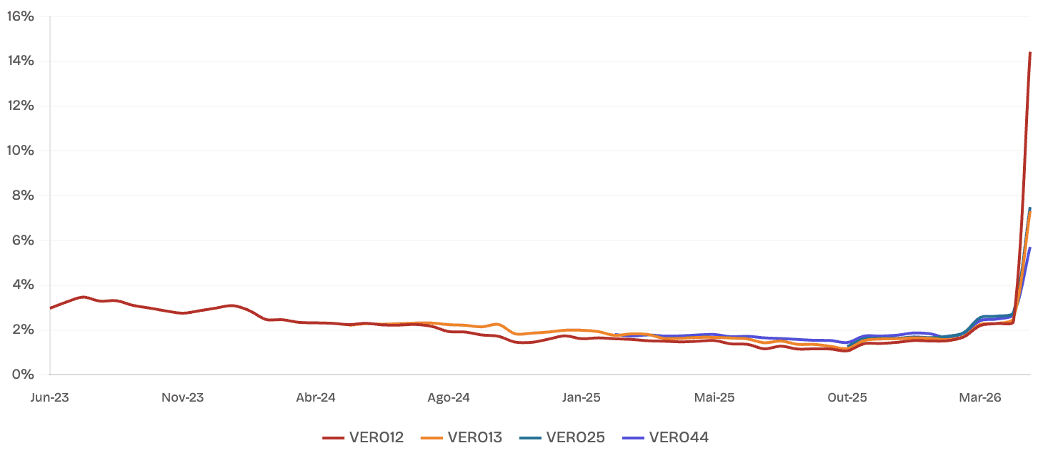 Spread Over NTN-B (% a.a.) · VERO12, VERO13, VERO25, VERO44 · Fonte: ANBIMA · Ref: 2026-04-24